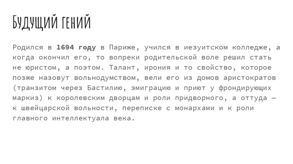 Будущий генийРодился в 1694 году в Париже, учился в иезуитском колледже, а