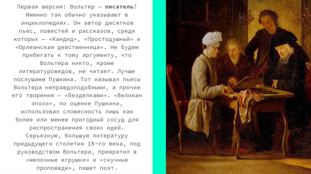 Первая версия: Вольтер — писатель?Именно так обычно указывают в