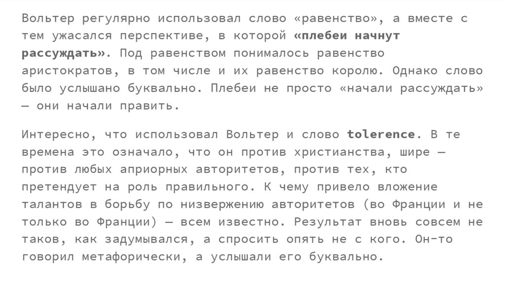 Вольтер регулярно использовал слово «равенство», а вместе стем ужасался перспективе, в которой «плебеи начнут