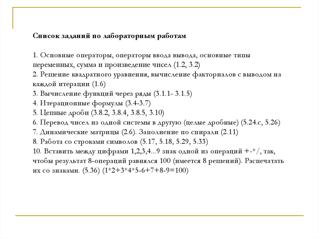 Список заданий по лабораторным работам1. Основные операторы, операторы ввода вывода, основные типы