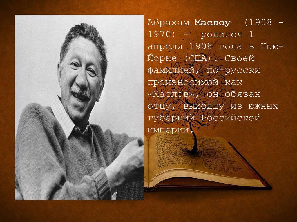 Абрахам Маслоу (1908 1970) - родился 1апреля 1908 года в НьюЙорке (США). Своей