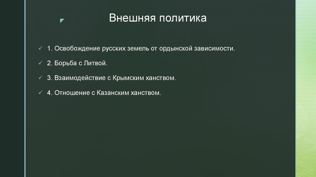 1. Освобождение русских земель от ордынской зависимости.