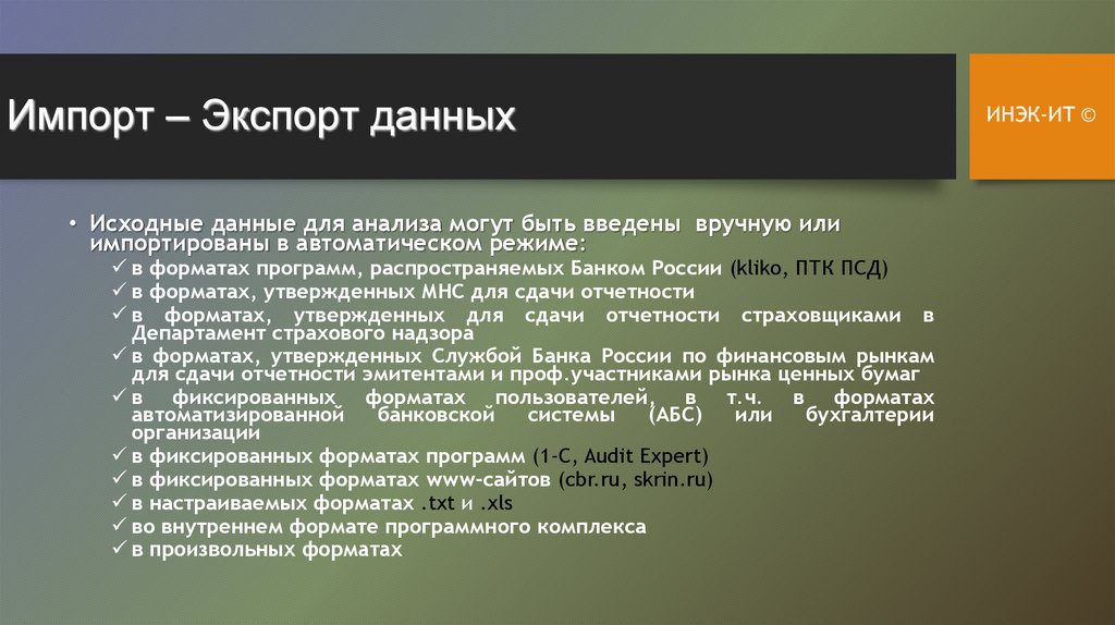 Импорт – Экспорт данных• Исходные данные для анализа могут быть введены вручную или