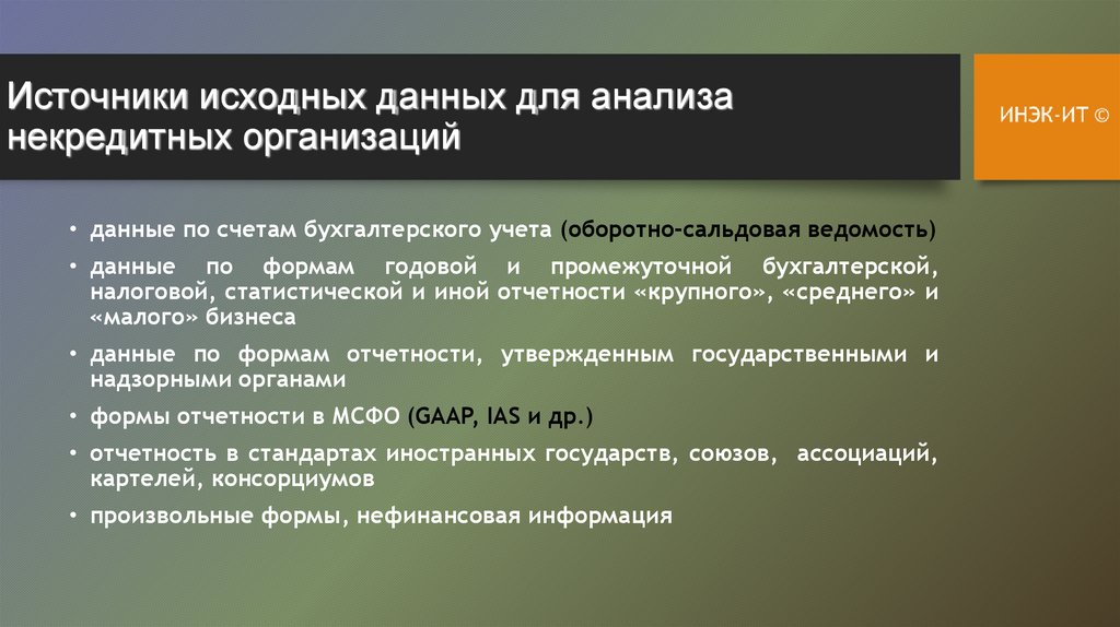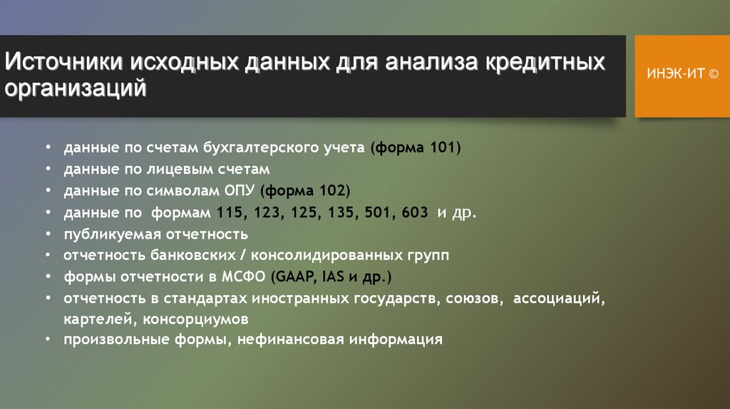 Источники исходных данных для анализанекредитных организаций