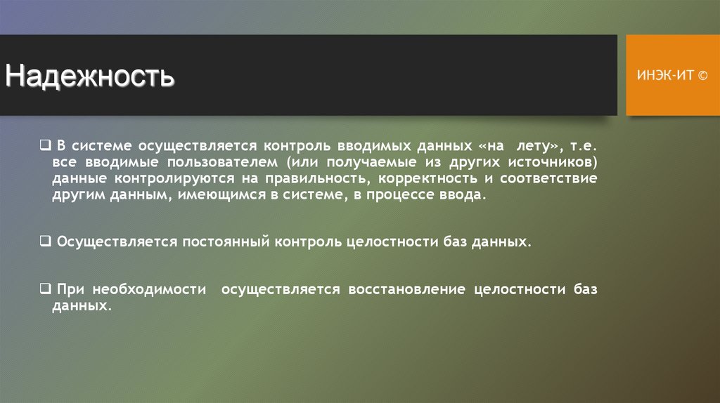 НадежностьВ системе осуществляется контроль вводимых данных «на лету», т.е.