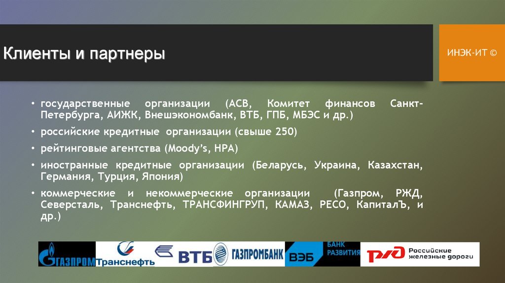 Клиенты и партнеры• государственные организации (АСВ, Комитет финансов