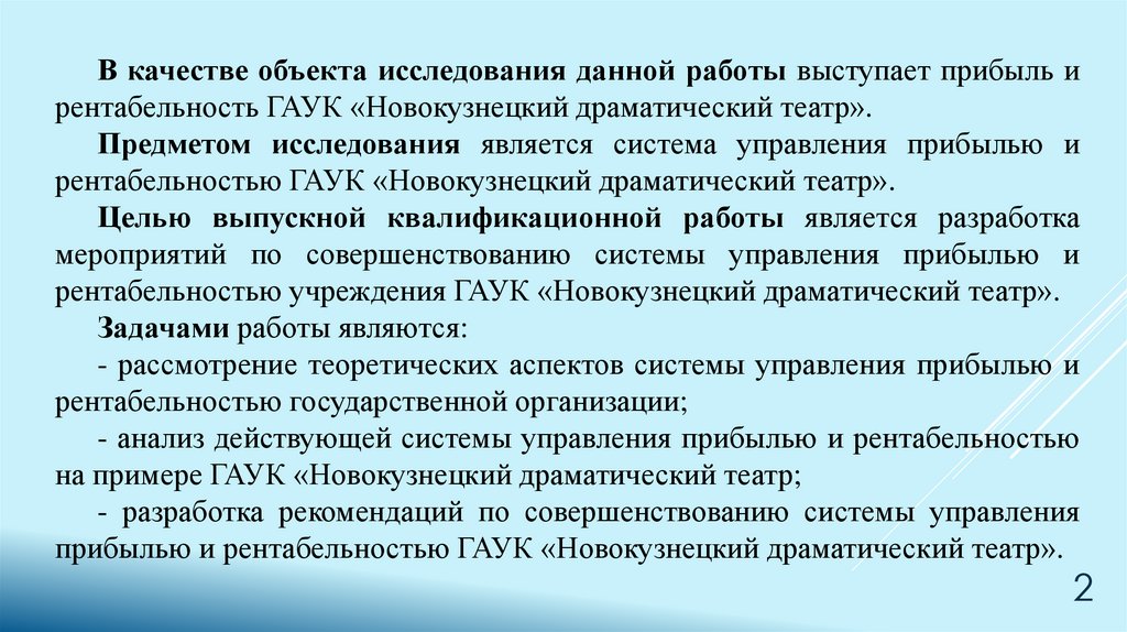 В качестве объекта исследования данной работы выступает прибыль ирентабельность ГАУК «Новокузнецкий драматический театр».