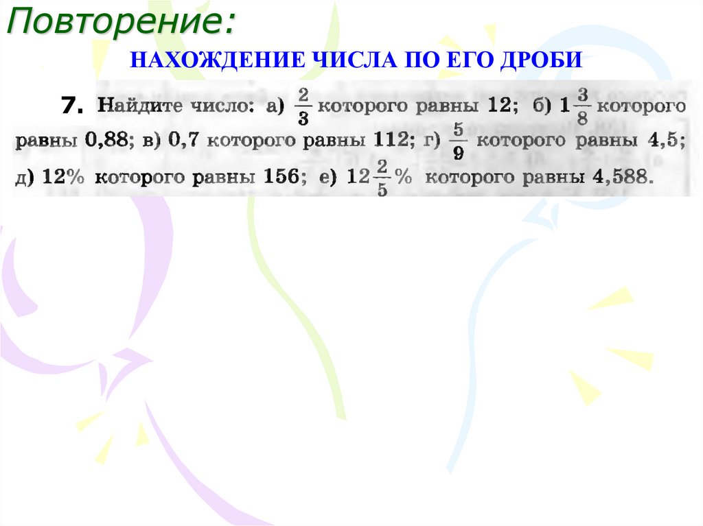 Повторение:НАХОЖДЕНИЕ ЧИСЛА ПО ЕГО ДРОБИ