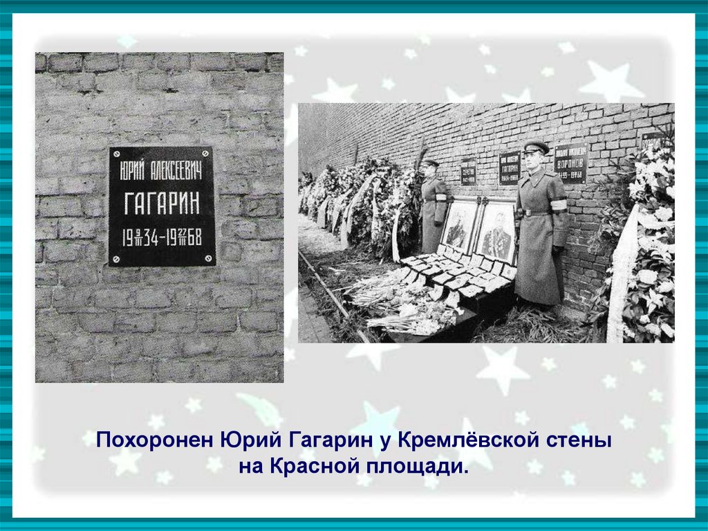 Похоронен Юрий Гагарин у Кремлёвской стенына Красной площади.