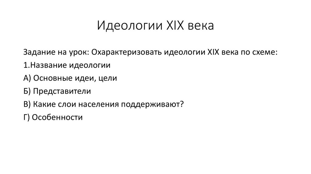 Идеологии XIX векаЗадание на урок: Охарактеризовать идеологии XIX века по схеме:
