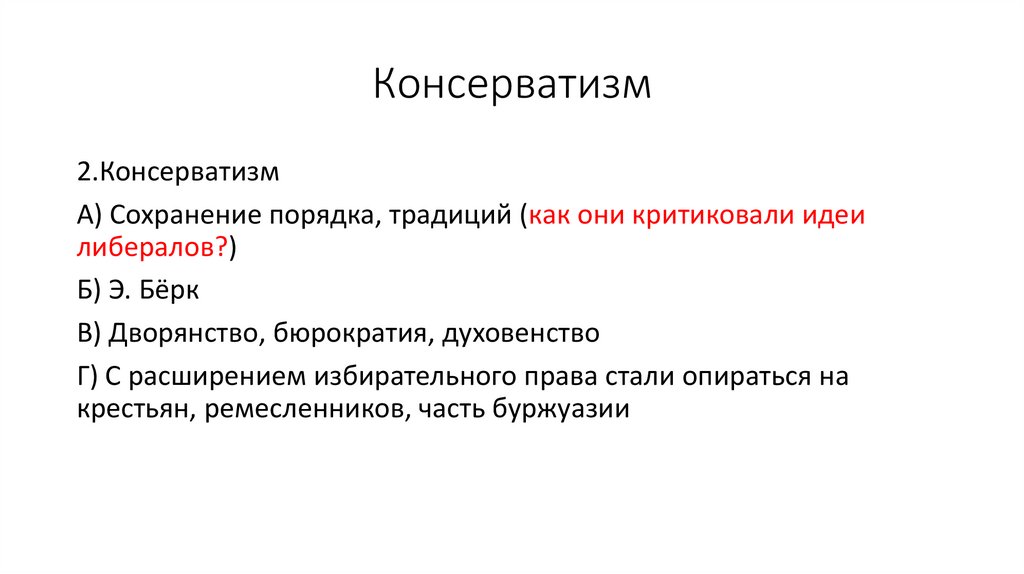 А) Сохранение порядка, традиций (как они критиковали идеи