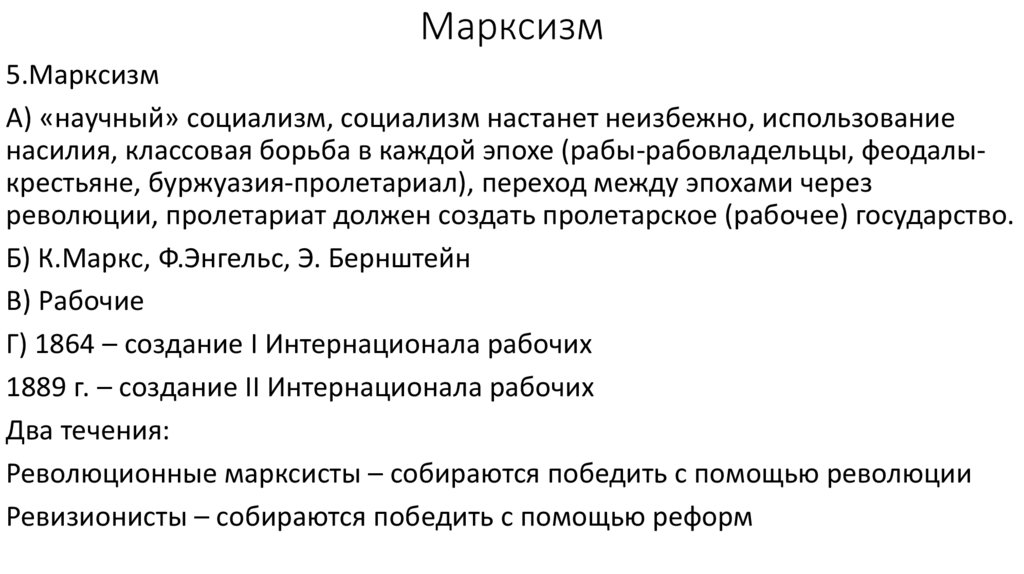 насилия, классовая борьба в каждой эпохе (рабы-рабовладельцы, феодалыкрестьяне, буржуазия-пролетариал), переход между эпохами через