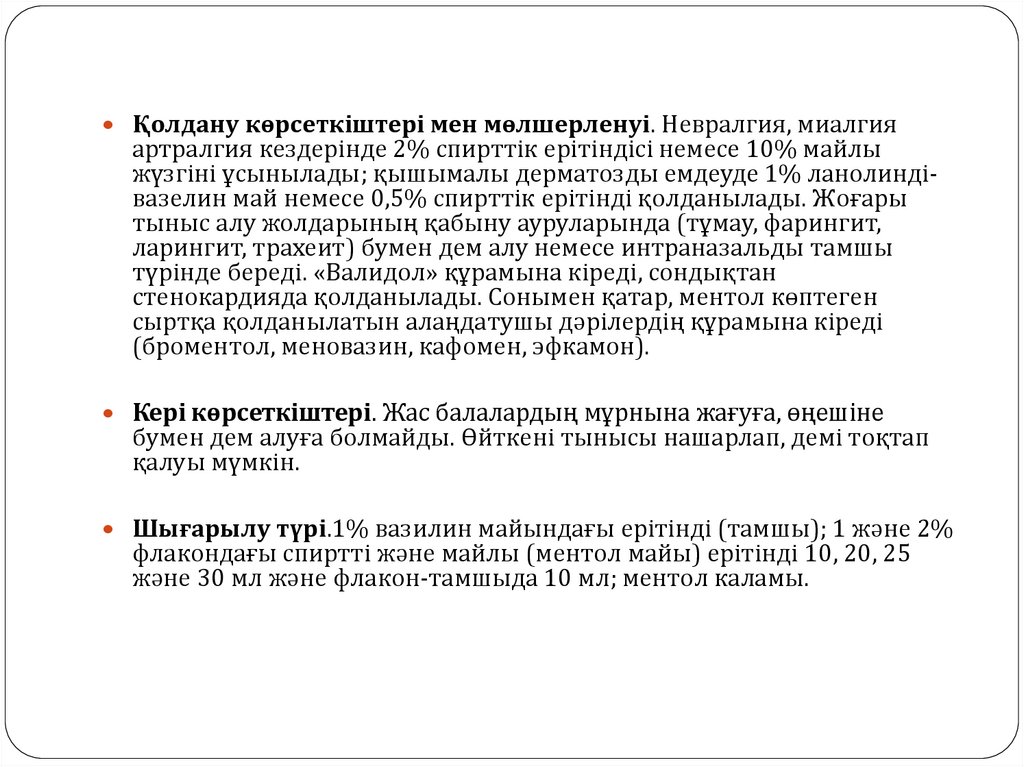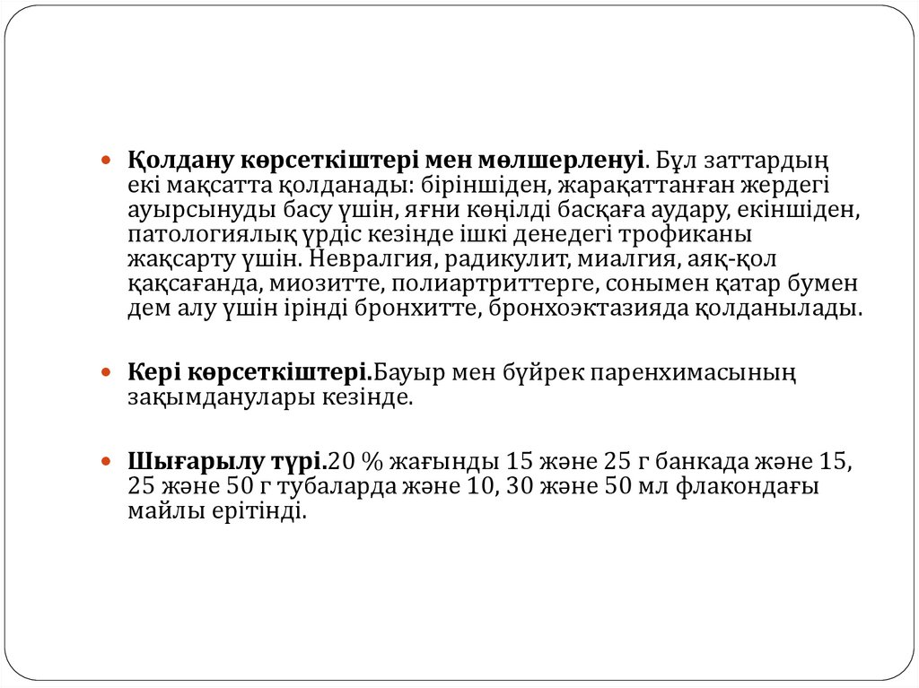 Қолдану көрсеткіштері мен мөлшерленуі. Невралгия, миалгияартралгия кездерінде 2% спирттік ерітіндісі немесе 10% майлы