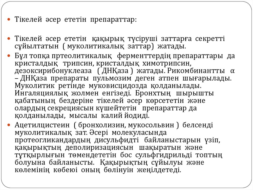 Тікелей әсер ететін препараттар:Тікелей әсер ететін қақырық түсіруші заттарға секретті