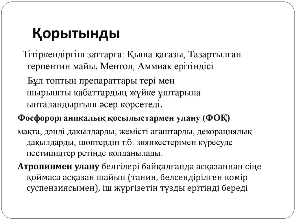 Тітіркендіргіш заттар. Рефлексті әсерлі қақырық түсіретін дәрілері. ФОҚ-мен улану