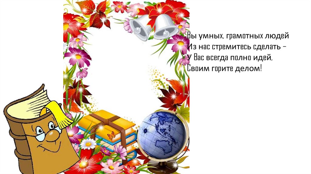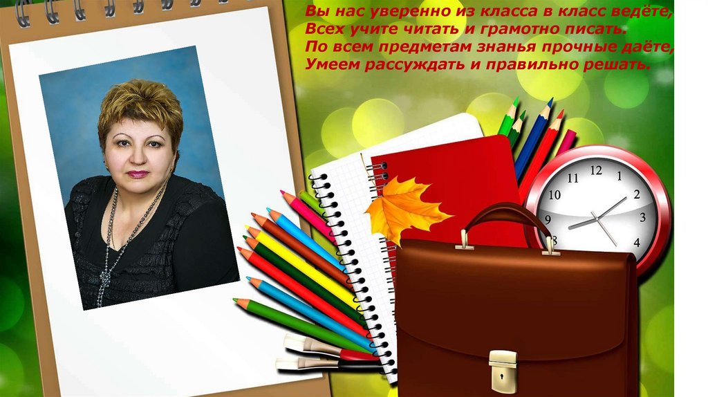 Вы нас уверенно из класса в класс ведёте,Всех учите читать и грамотно писать.