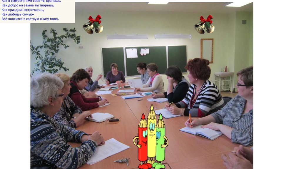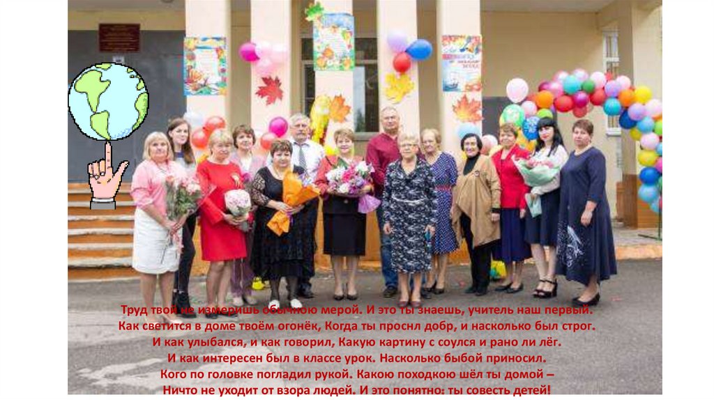 Труд твой не измеришь обычною мерой. И это ты знаешь, учитель наш первый.Как светится в доме твоём огонёк, Когда ты проснл добр, и насколько был строг.
