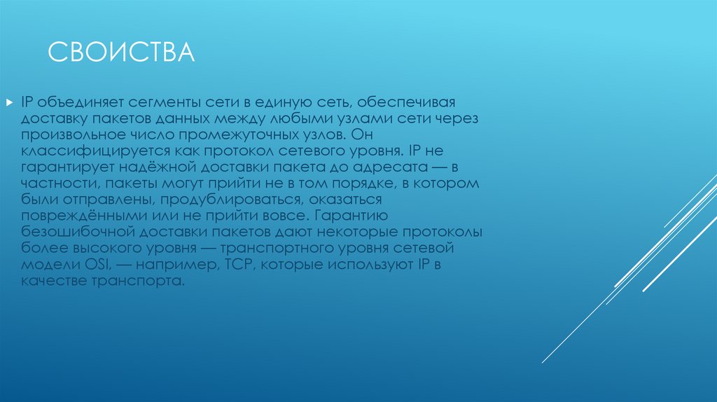 СВОИСТВАIP объединяет сегменты сети в единую сеть, обеспечивая