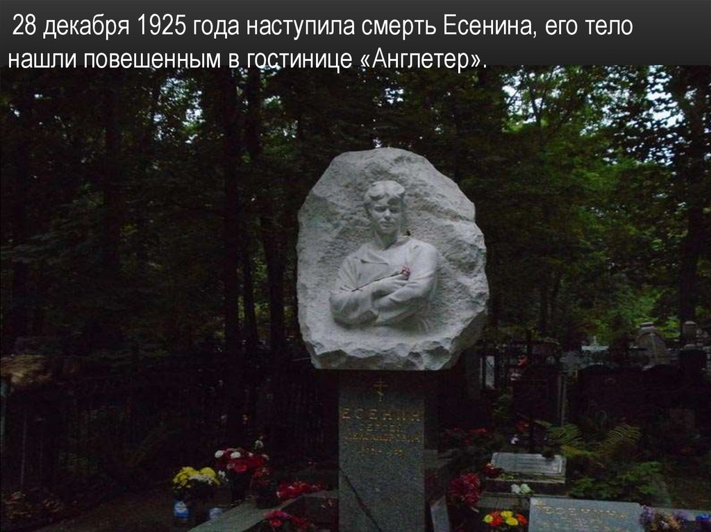 28 декабря 1925 года наступила смерть Есенина, его телонашли повешенным в гостинице «Англетер».