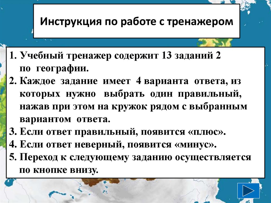 Инструкция по работе с тренажером1. Учебный тренажер содержит 13 заданий 2