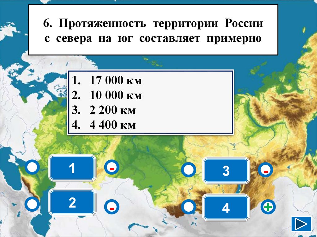 6. Протяженность территории Россиис севера на юг составляет примерно