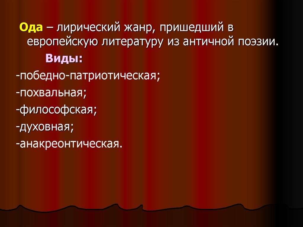 Ода – лирический жанр, пришедший вевропейскую литературу из античной поэзии.