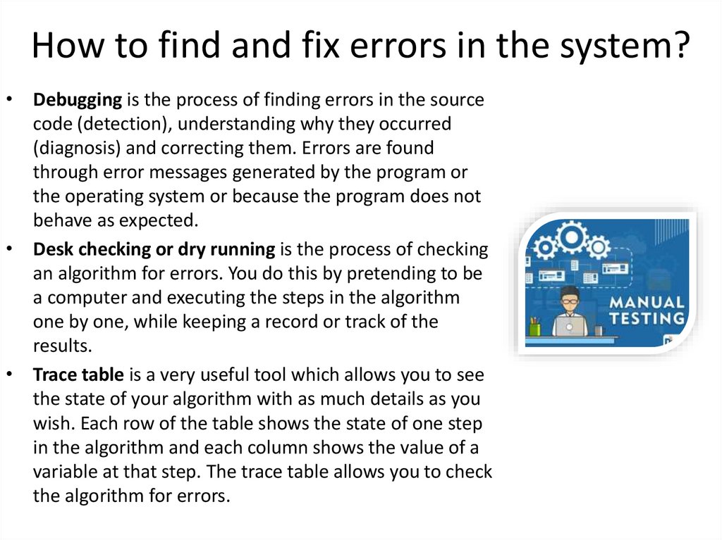 How to find and fix errors in the system?• Debugging is the process of finding errors in the source
