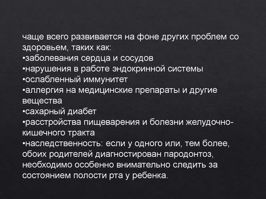 чаще всего развивается на фоне других проблем создоровьем, таких как: