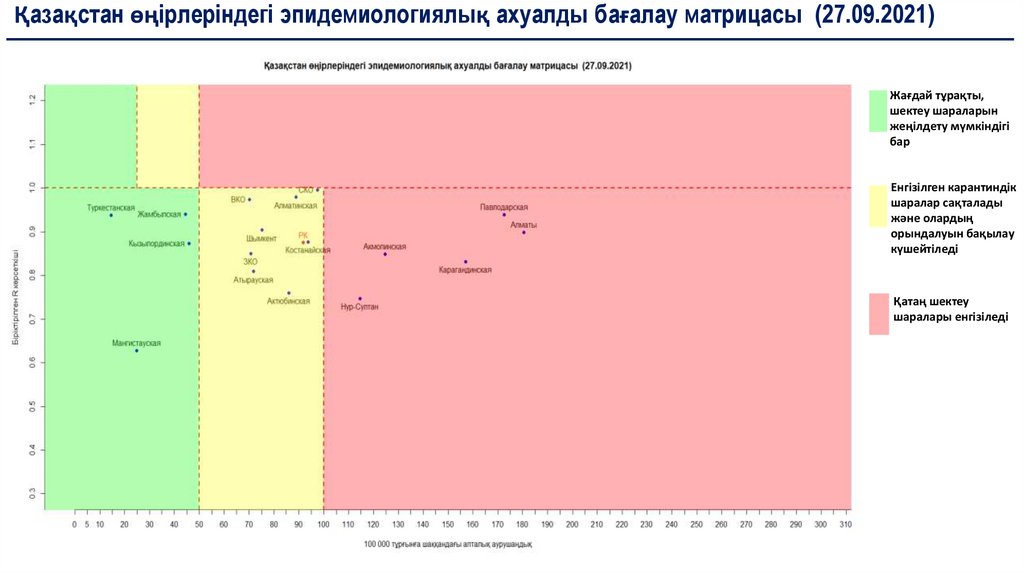 Қазақстан өңірлеріндегі эпидемиологиялық ахуалды бағалау матрицасы (27.09.2021)Жағдай тұрақты,