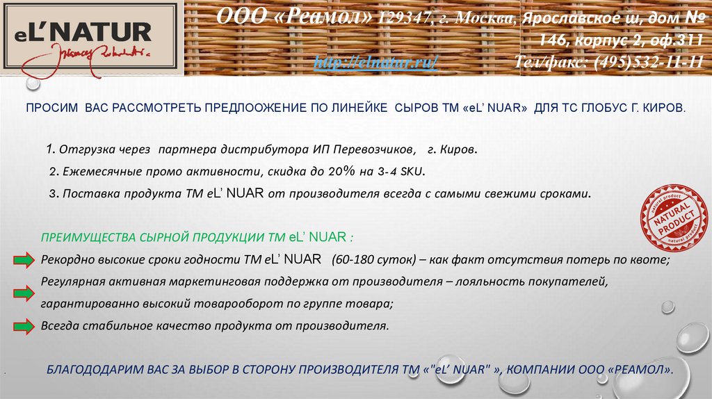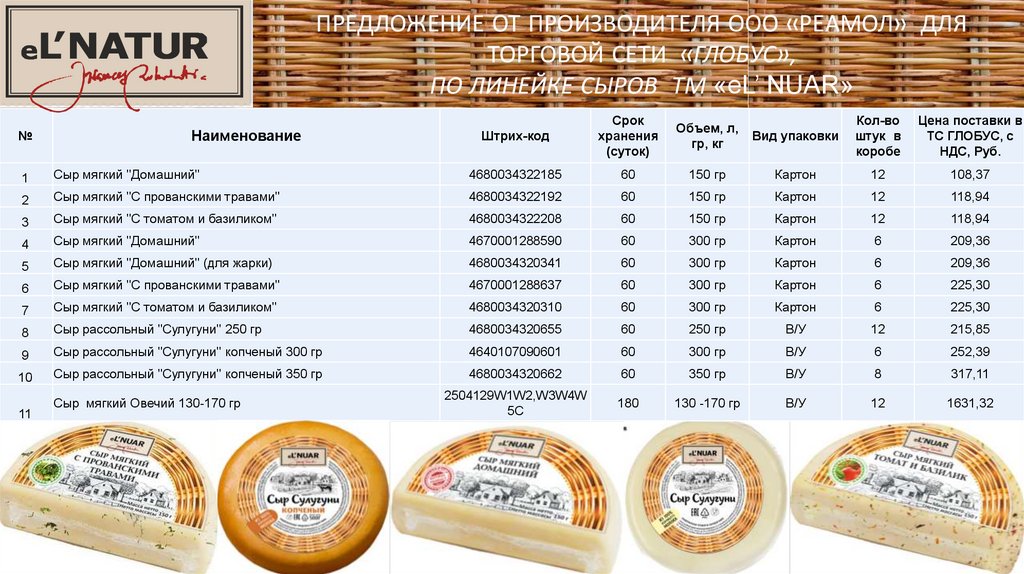 ПРОСИМ ВАС РАССМОТРЕТЬ ПРЕДЛООЖЕНИЕ ПО ЛИНЕЙКЕ СЫРОВ ТМ «eL’ NUAR» ДЛЯ ТС ГЛОБУС Г. КИРОВ.