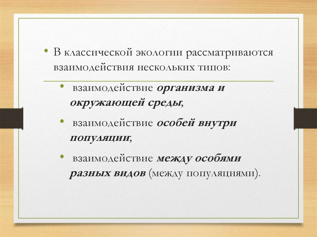 • В классической экологии рассматриваютсявзаимодействия нескольких типов: