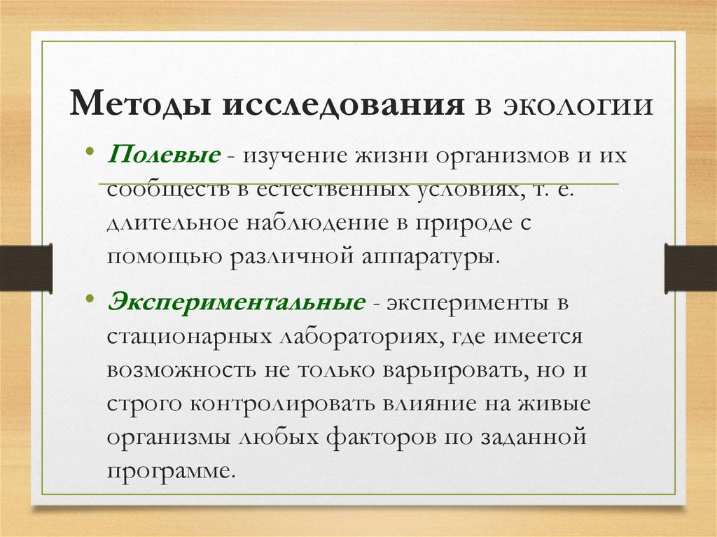 Методы исследования в экологии• Полевые - изучение жизни организмов и их