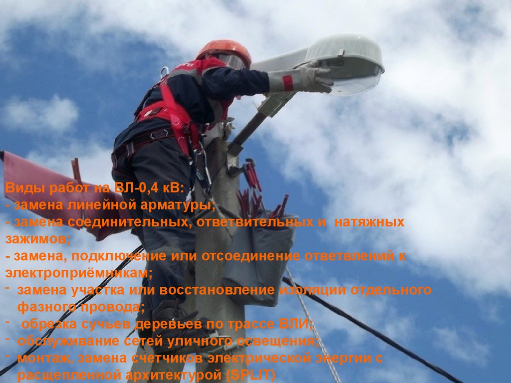Виды работ на ВЛ-0,4 кВ:- замена линейной арматуры;