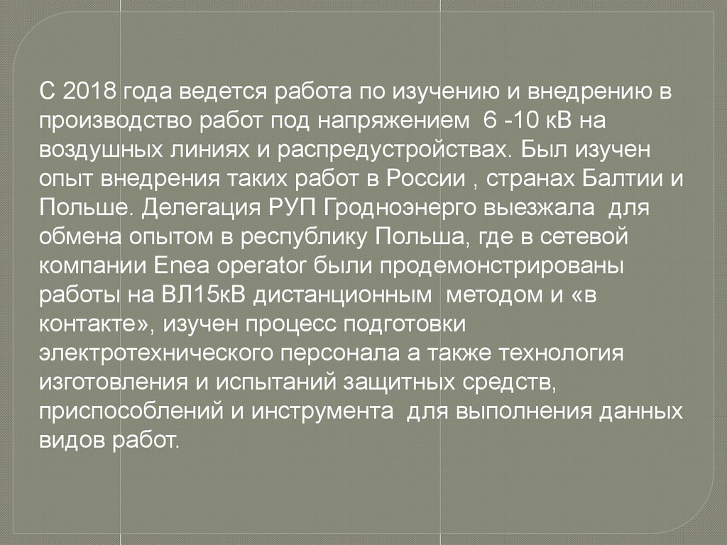 С 2018 года ведется работа по изучению и внедрению впроизводство работ под напряжением 6 -10 кВ на