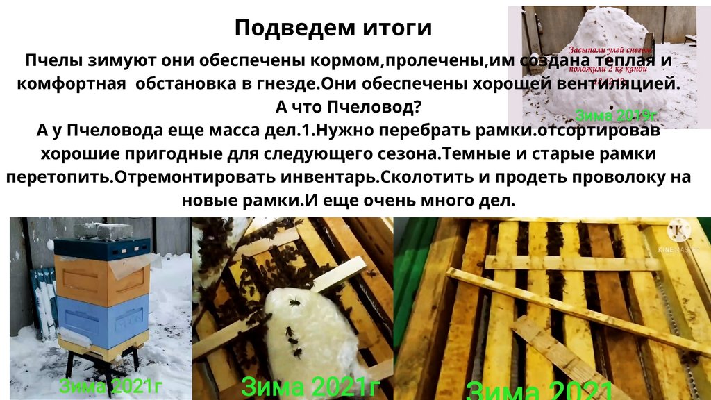 Подведем итогиПчелы зимуют они обеспечены кормом,пролечены,им создана теплая и
