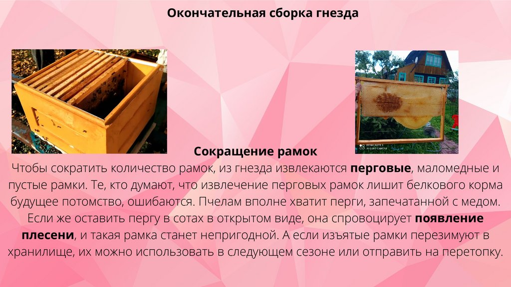 Чтобы сократить количество рамок, из гнезда извлекаются перговые, маломедные и