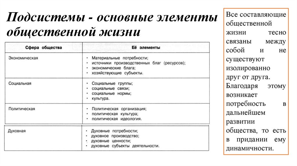 Подсистемы - основные элементыобщественной жизни