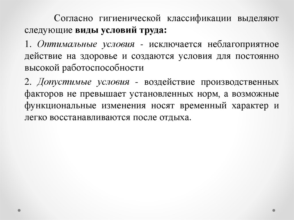 Согласно гигиенической классификации выделяютследующие виды условий труда: