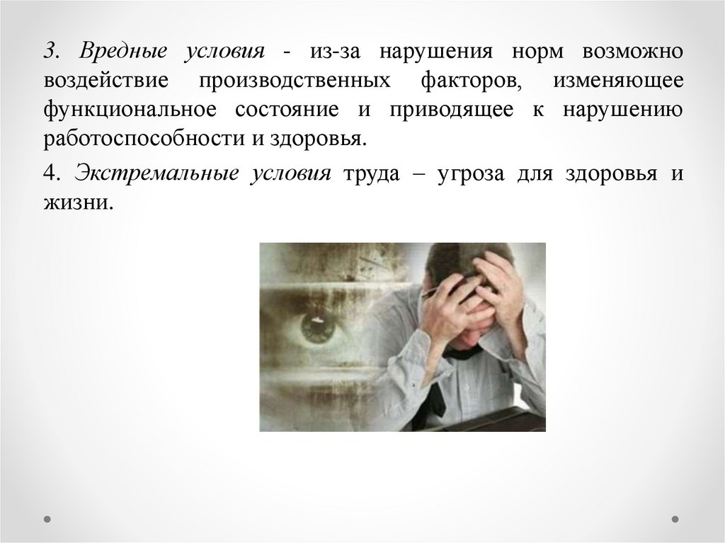 3. Вредные условия - из-за нарушения норм возможновоздействие производственных факторов, изменяющее