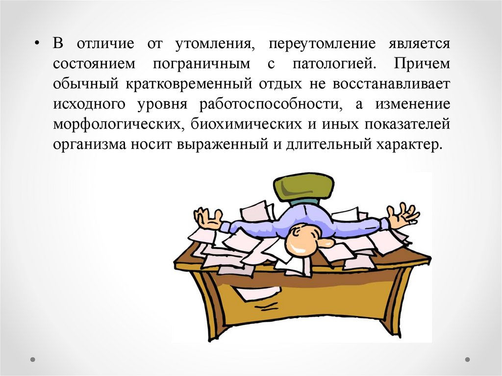 • В отличие от утомления, переутомление являетсясостоянием пограничным с патологией. Причем