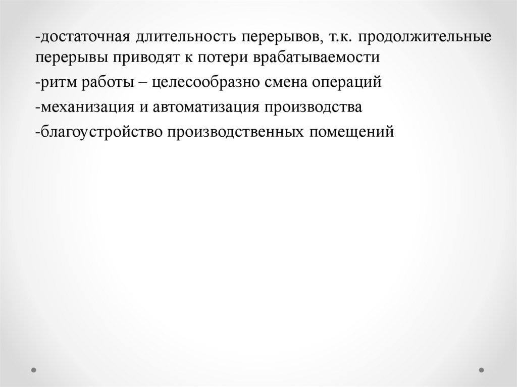 -достаточная длительность перерывов, т.к. продолжительныеперерывы приводят к потери врабатываемости
