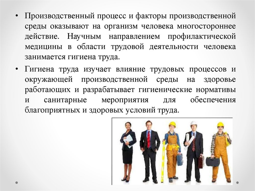 • Гигиена труда изучает влияние трудовых процессов и