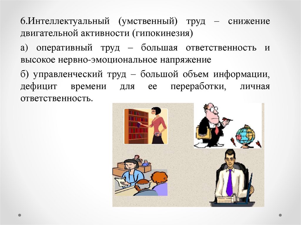 6.Интеллектуальный (умственный) труд – снижениедвигательной активности (гипокинезия)