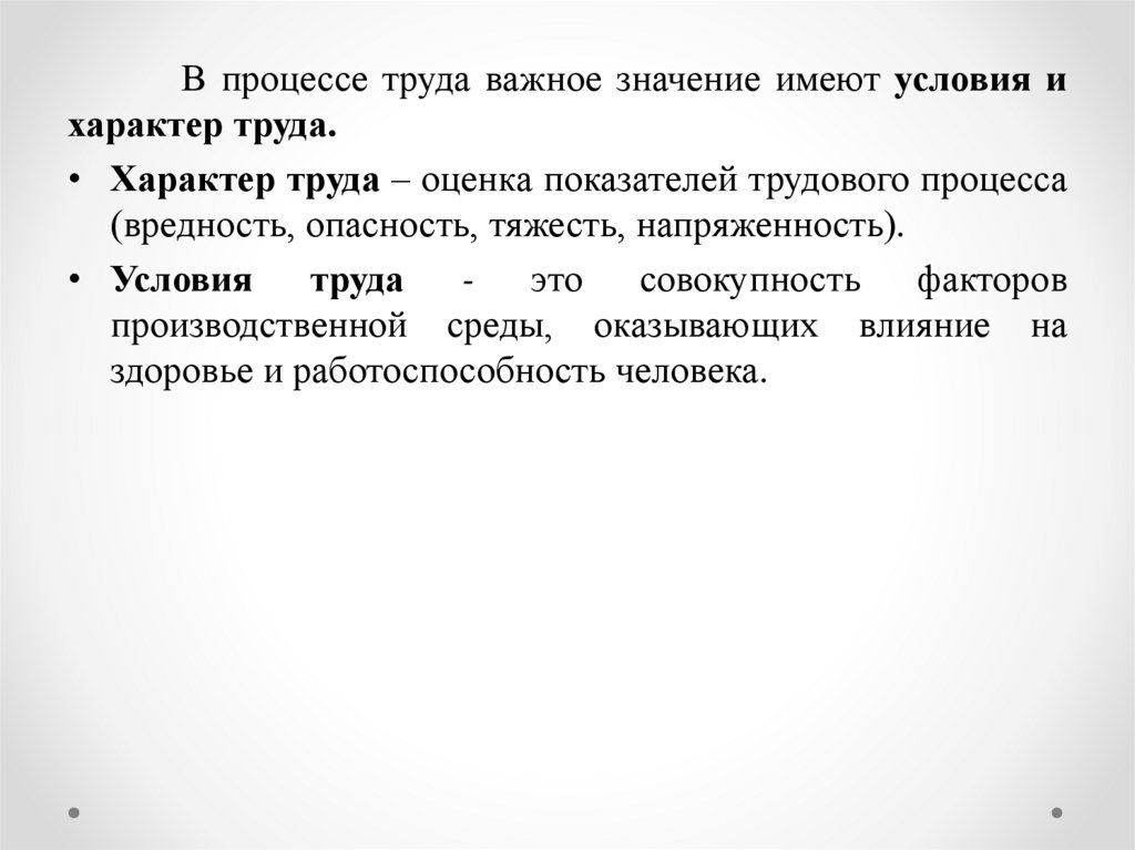 В процессе труда важное значение имеют условия ихарактер труда.