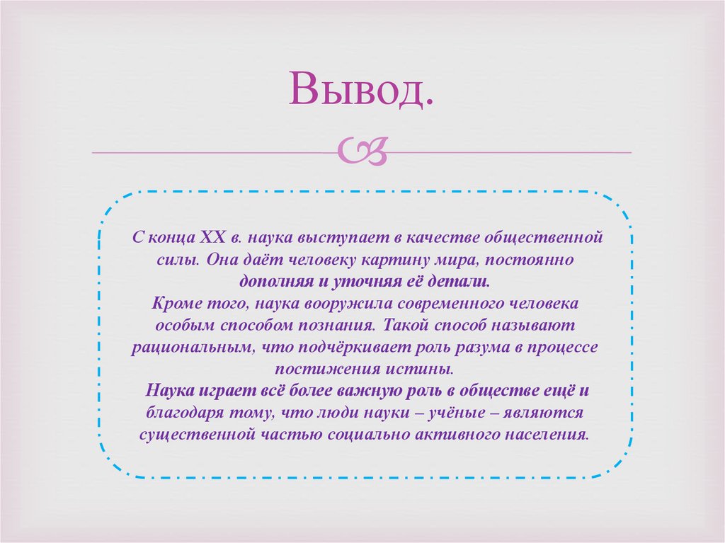 Вывод.С конца XX в. наука выступает в качестве общественной