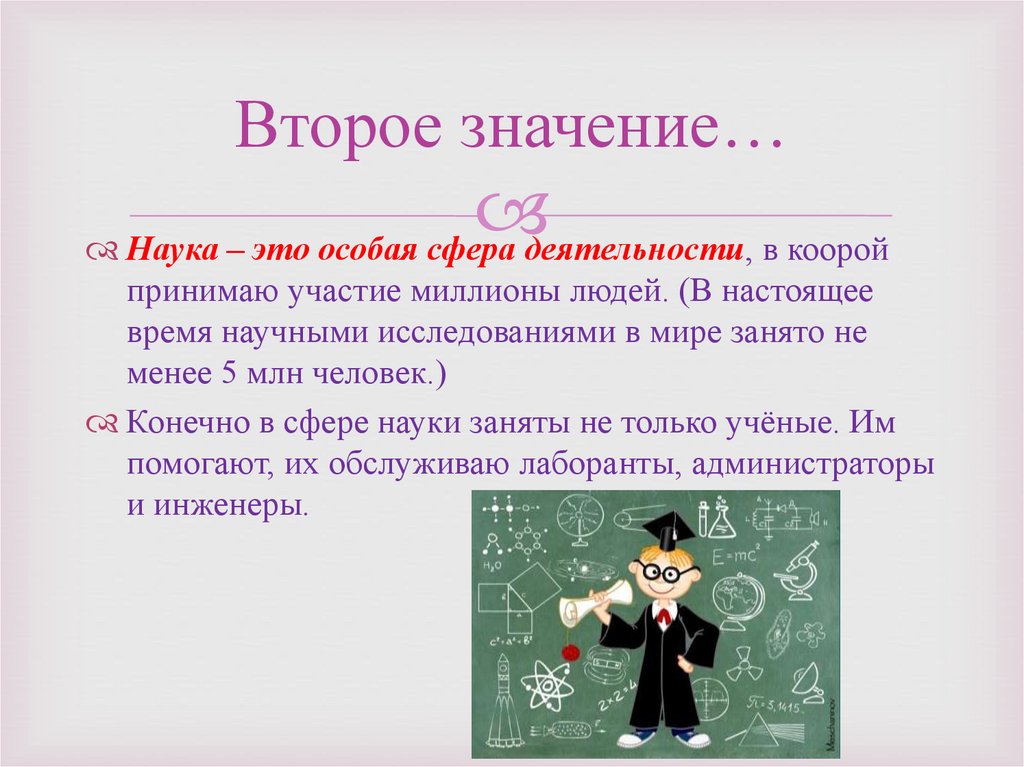 Второе значение…Наука – это особая сфера деятельности, в коорой