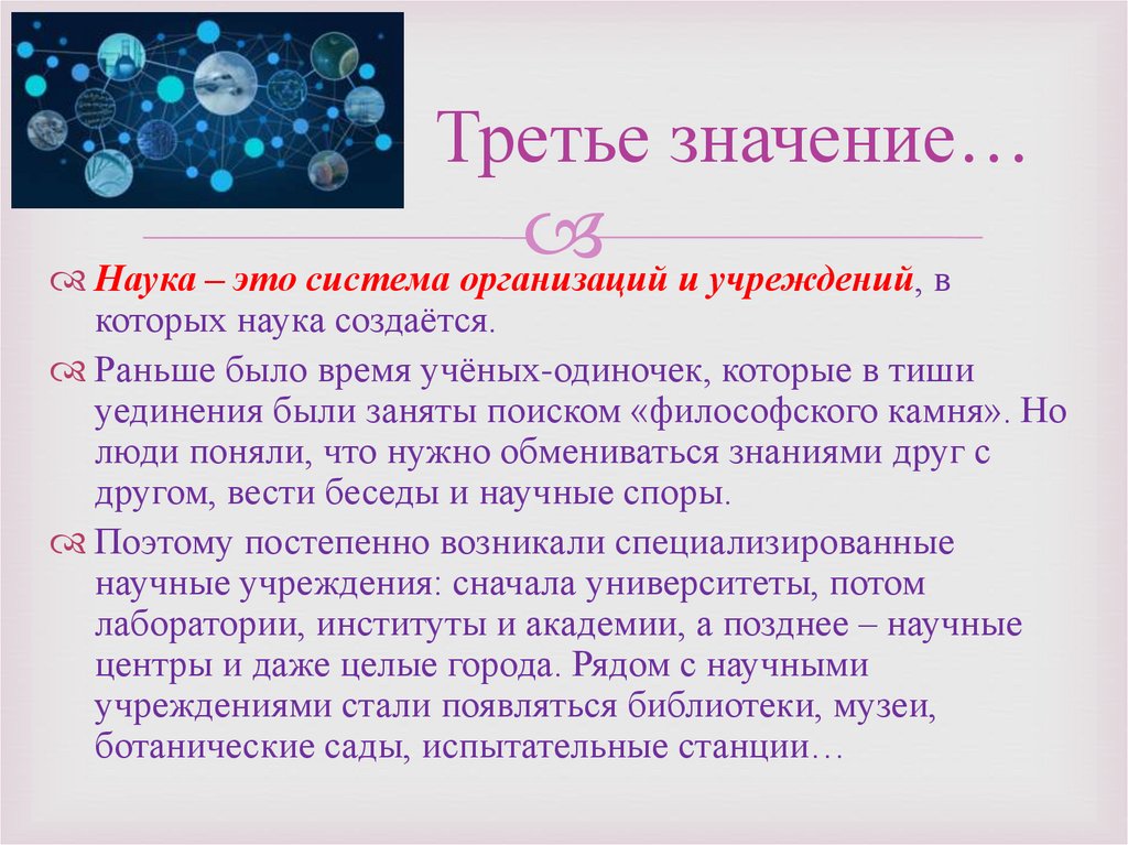 Третье значение…Наука – это система организаций и учреждений, в