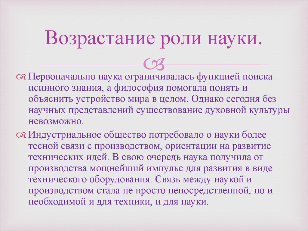 Возрастание роли науки.Первоначально наука ограничивалась функцией поиска