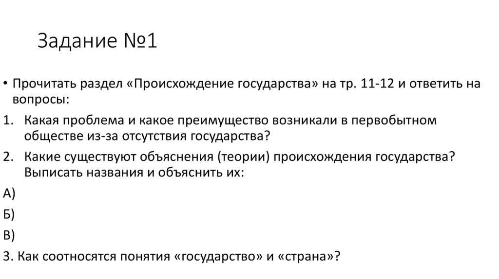 Задание №1• Прочитать раздел «Происхождение государства» на тр. 11-12 и ответить на