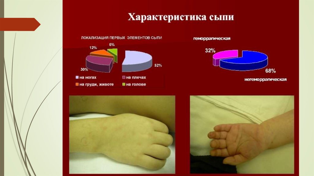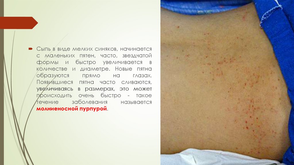 Развитие экзантемыСыпь в виде мелких синячков, начинается с маленьких синих пятен